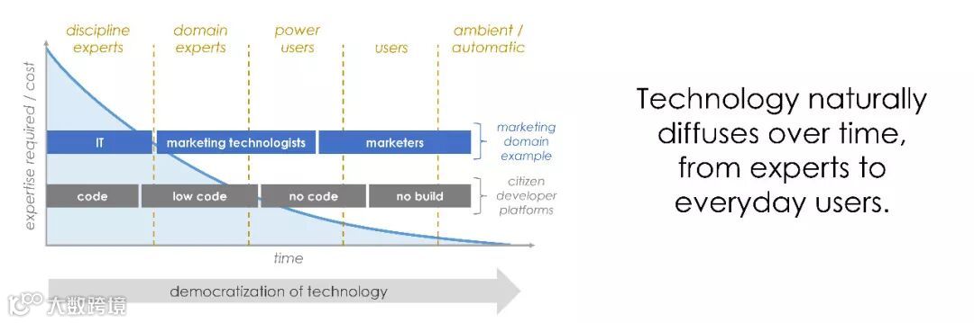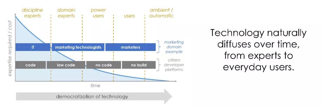 所谓软件设计,过去被认为都是专家才能完成的,必须要学程序语言,编程语言等等。但是,所谓的「无密码平台」最开始在美国出现,然后全世界都开始运用这种平台,越来越多的营销专业人士或者是技术人士,已经可以利用当地的营销系统来建立一些应用平台,进行客户服务或内部运营,一些广告主也开始利用这个平台,他们成为了「超级用户」。