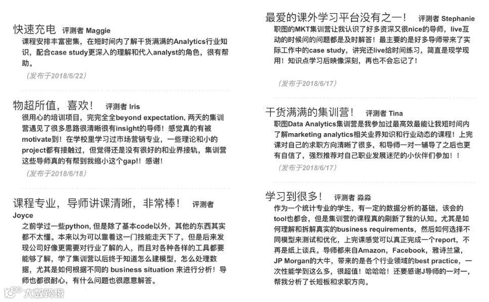 为了解决你遇到的这些问题,职图精心研发了【Data Analytics集训营课程】,在互联网、科技、电商、保险、银行、广告营销等领域的名企导师带领下高效学习,快速进步,让你在两周充实的课程学习中,进入营销数据分析师的大门。