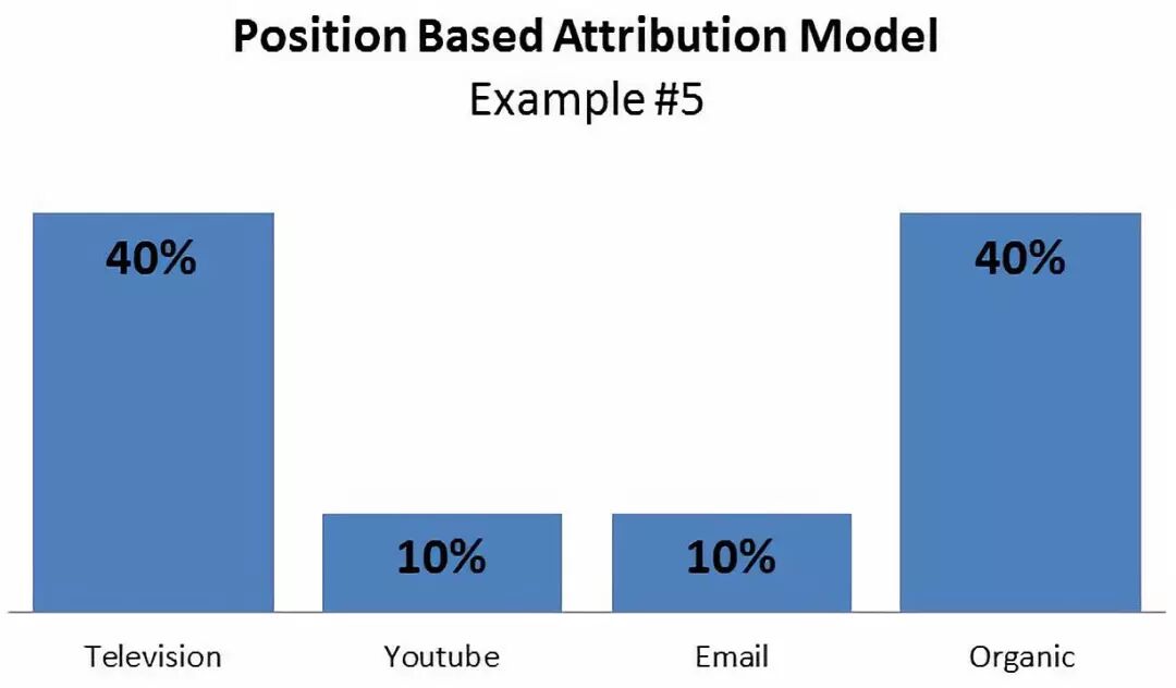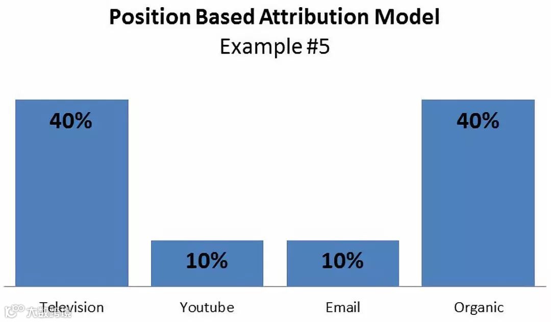 ● 使用场景:如果你想要给整个推广过程中的所有渠道都分一杯羹,并且你认为第一和最后一个渠道比剩下的渠道对消费者的影响占的比重更重的话,你可以考虑使用这个模型。