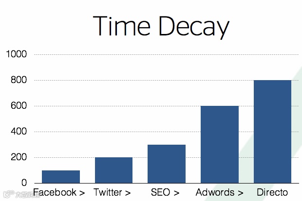● 衡量指标:Time decay 模型通常将最大的功劳分配给离购买时间最近的那些渠道,同时也考虑到其他的渠道。