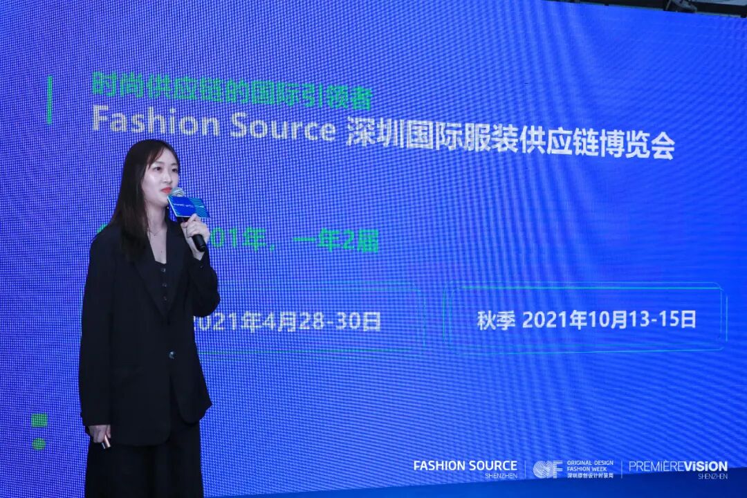智奥鹏城(深圳)展览有限公司张琬晴女士对三个展会项目进行了详细介绍:“本届Fashion Source展会将继续实现三展联动,以“链接、商业、趋势、创意、引领”为核心定位,55,000平米展示面积、600余家优选展商、7大独立展区,汇聚康赛妮、新澳纺织、中鼎、全顺集团、鄂尔多斯、绒创绒业、中多、凯喜雅、实益长丰、迪尚、杭丝等行业领军企业,展品涵盖纱线、面料、辅料、皮衣皮草、羽绒服、大衣、内衣、家居服、女装、男装、童装、牛仔、 配饰、鞋包等产品品类。第8届深圳原创设计时装周以“繁FUN”为主题,15场时尚大秀精彩呈现,用包容的态度迎接时尚领域的变化与挑战,繁育新生的设计力量,寻找创意有趣的灵感来源。第2届Première Vision品锐至尚深圳展,精选隆丰皮草、梅花、协孚、罗曼罗兰、松井、西猛、鑫兰、新生、福恩、嘉欣丝绸、dutel création、Malhia Kent、La Fille等来自法国、意大利、土耳其、西班牙等国家及地区的50余家知名品牌,涵盖纱线、面料、辅料、皮革、成衣五大板块。”
