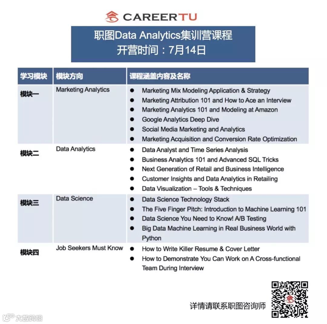为了解决你遇到的这些问题,职图精心研发了【Data Analytics集训营课程】,在互联网、科技、电商、保险、银行、广告营销等领域的名企导师带领下高效学习,快速进步,让你在两周充实的课程学习中,进入营销数据分析师的大门。