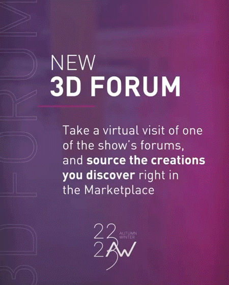 得益于 Matterport 虚拟访问技术,这个独特的 3D 趋势区将通过 Première Vision 时尚团队在 Give It Flair 趋势区精选的约 50 个参考产品来展示本季的材料亮点。点击虚拟空间中展示的每个产品,访问者将能够了解产品属性,并可跳转至 Première Vision Marketplace 平台上相关供应商的在线商店。