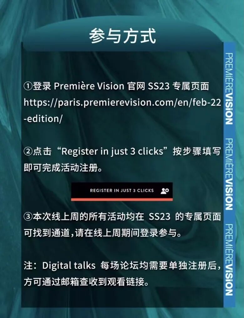 新年伊始,疫情依旧,Première Vision严格遵守当前的疫情防控要求,积极准备以最佳的方式举办展会。创意时尚行业需要面对面沟通,共同探讨,以便继续发展业务。Première Vision 巴黎展对此给予全力支持,同时启动线上&线下双展,让行业专业人士汇聚一堂,面对面交流创意,引导并启发 23春夏季的系列设计。2月8-10日在巴黎北郊维勒班展览中心(4、5、6 号馆)举行线下展。2月7日至11日在 paris.premierevision.com官方网站举办DIGITAL WEEK线上周。