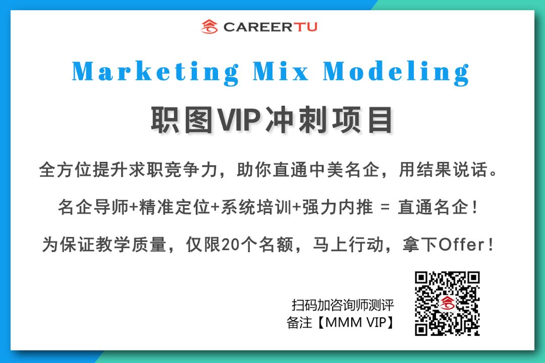 职图VIP冲刺项目,不仅包括Marketing Mix Model, 还包括其他热门方向如Digital Marketing, Product Design, Growth Marketing等,导师手把手指导项目还包含:Google Adwords, Facebook Ads, UXUI design 等,详情请加职图咨询师(微信号careertututor)了解。