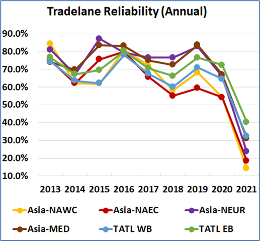 |全球历年船期可靠性,图源sea-intelligence,下同