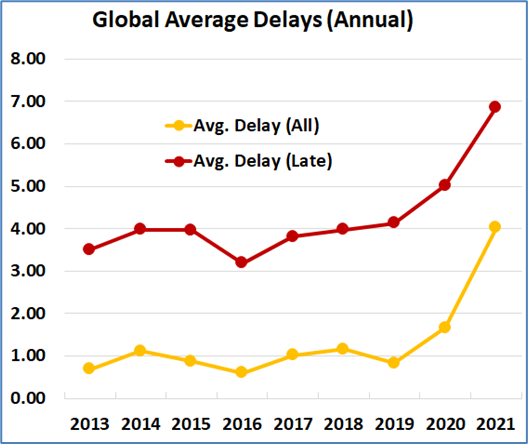 在延误方面,所有六条贸易航线都遵循相同的总体趋势。2021年,亚洲-北美西海岸的LATE船舶平均延误增幅最大,延误时间超过12天,而亚洲-北欧紧随其后,超过8天。