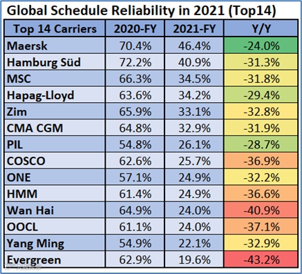 可以看出马士基2021年的船期可靠性为46.4%,位居第一。其次是汉堡南美 40.9%。在top14中有四家承运人的船期可靠性为 30%-40%,有七家承运人的船期可靠性为 20%-30%。只有长荣的船期可靠性低于20%。同时,排名前14的运营商在可靠性上全部低于上一年。