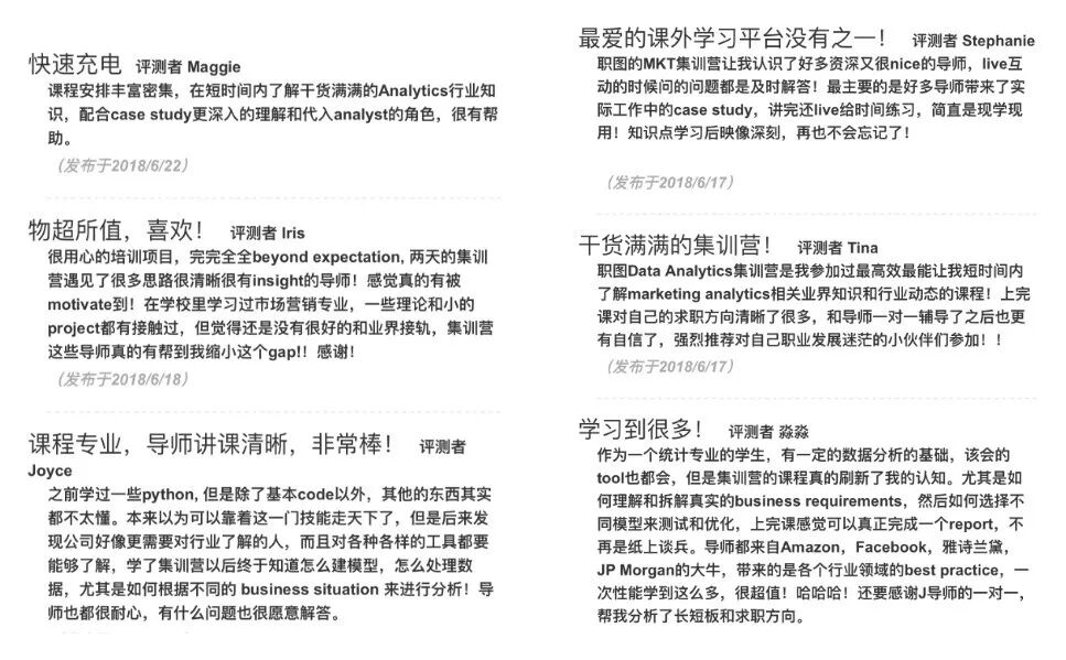 为了解决你遇到的这些问题,职图精心研发了【Data Analytics集训营课程】,在互联网、科技、电商、保险、银行、广告营销等领域的名企导师带领下高效学习,快速进步,让你在两周充实的课程学习中,进入营销数据分析师的大门。