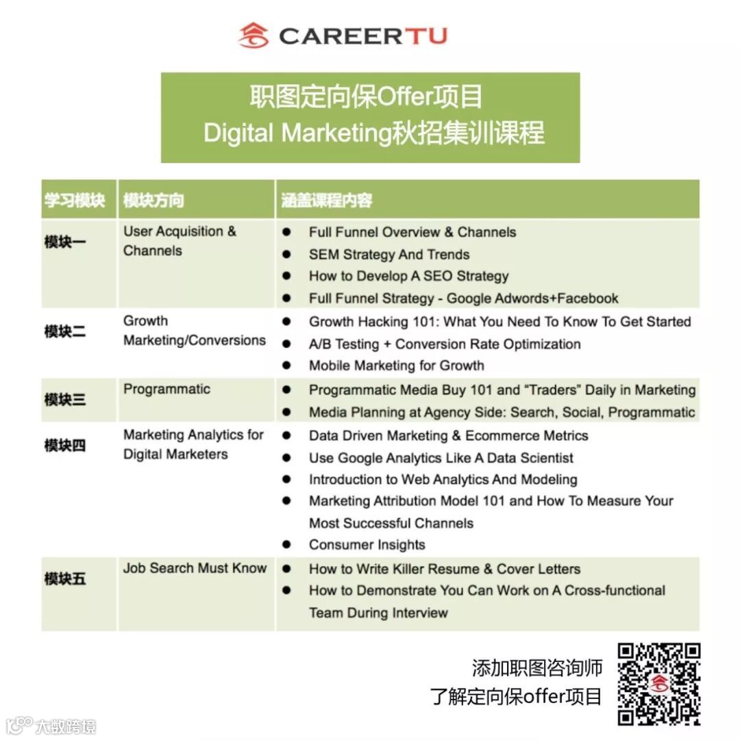 职图推出拳头产品【Digital Marketing秋招集训营 Live】,让来自Facebook,Google,Amazon,BMW, GrubHub,Bloomberg,MongoDB,The NPD Group,Commbond等名企导师,用15天时间,提供最系统全面的讲解、分析以及指导,把你打造成理论和实践兼备的实操性互联网营销人!