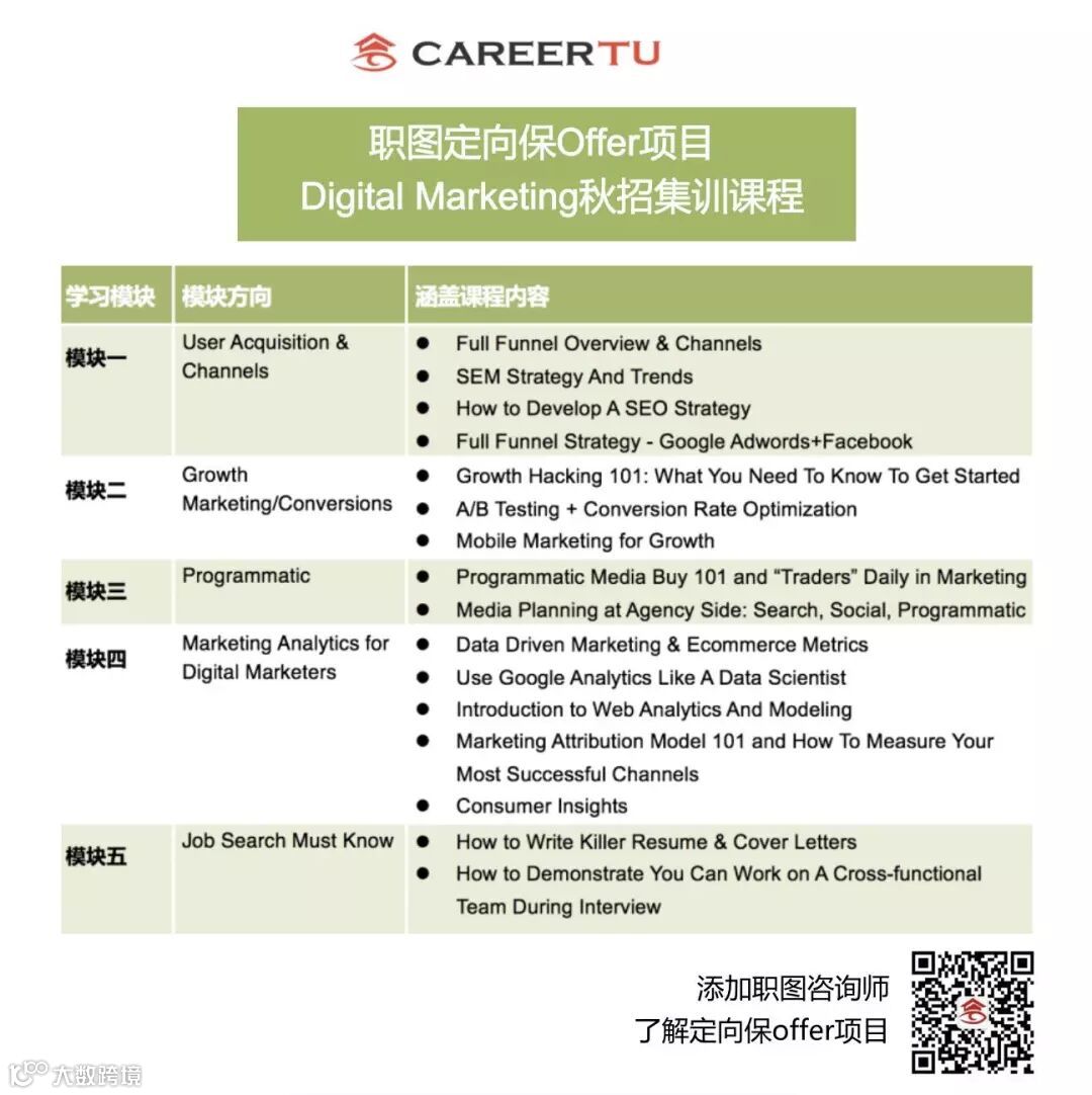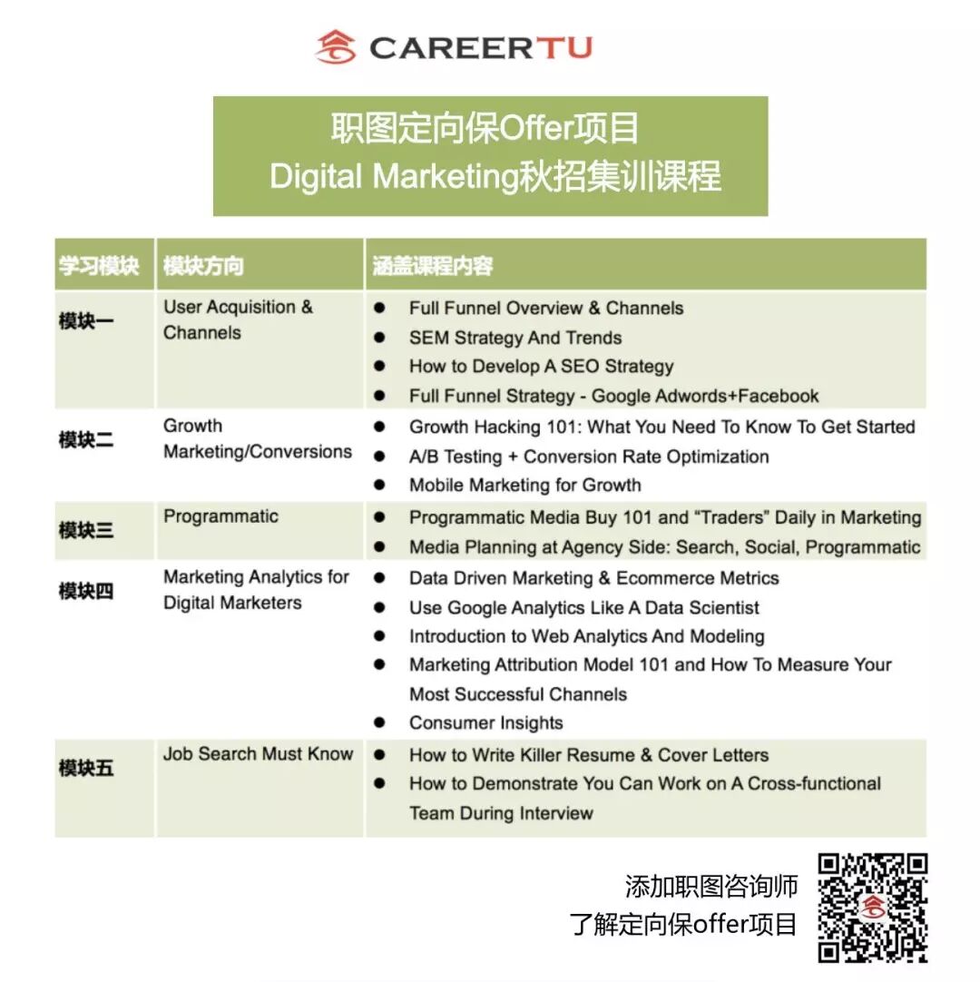 *加职图咨询师微信号(careertututor)获取详细课程表。
