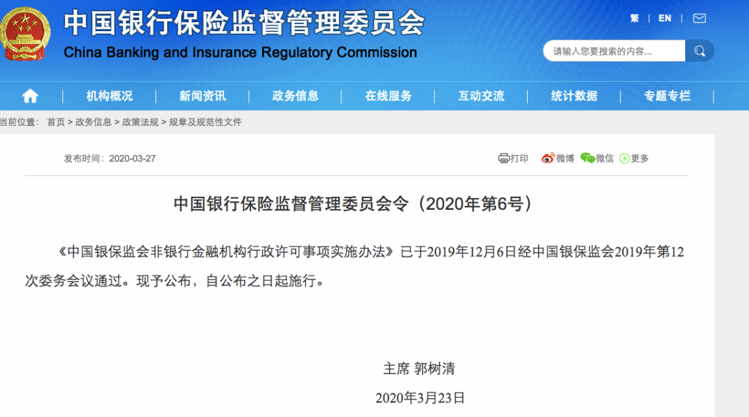 原《中国银监会非银行金融机构行政许可事项实施办法》已于本《办法》公布之日同时废止。银保监会相关负责人表示,随着非银机构的不断发展,部分许可规定需进一步完善以适应监管实际。本次《办法》修订着力于进一步强化监管政策引领,合理划分监管事权,提升准入监管质效。