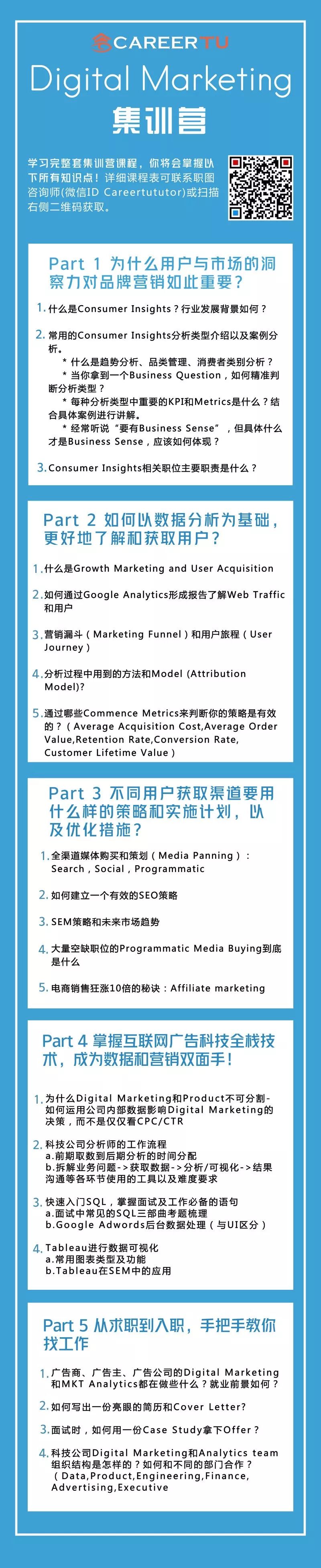 Digital Marketing 集训营(Live)课程,请到了拥有3年-10年行业经验的资深从业者,结合实际场景和案例,告诉你应该怎么选!大大降低你的求职试错成本,让你能够在最短时间内明确自己的求职目标!