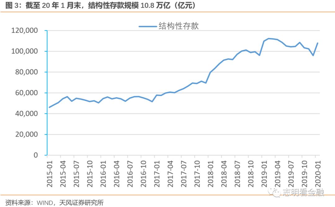 截至20年1月末,结构性存款10.8万亿,规模较大。我们预计新规促使结构性存款平均成本下降20BP,年化节约商业银行利息支出约216亿元,提振净利润增速0.81个百分点。
