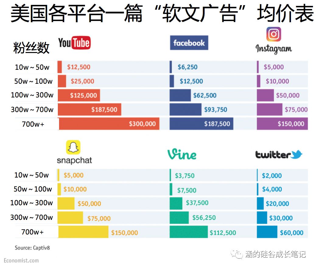 可以看到,最贵的是 YouTube 平台:如果你有7百万粉丝,那一个软植入的视频,将会卖到30万美金,差不多180万人民币。