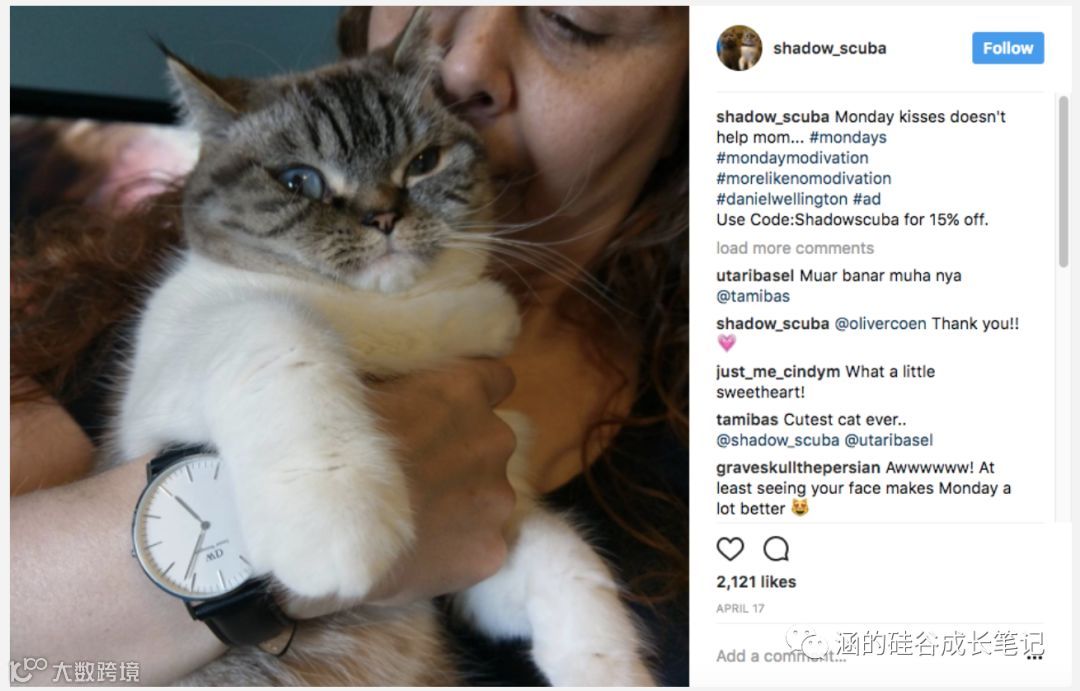 这个就是著名 DW 牌表。。他们请这个小网红,只花了几百块,但是收获了2千个赞。而且,转化率非常的高。