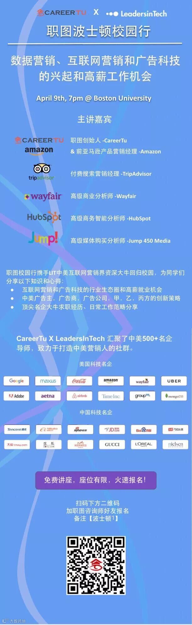 4月9日晚上7点-9点,职图CareerTu携手5位业界大牛来到BU校园讲座,他们就职于Amazon,TripAdvisor,Wayfair,Hubspot,Jump 450 Media等名企。