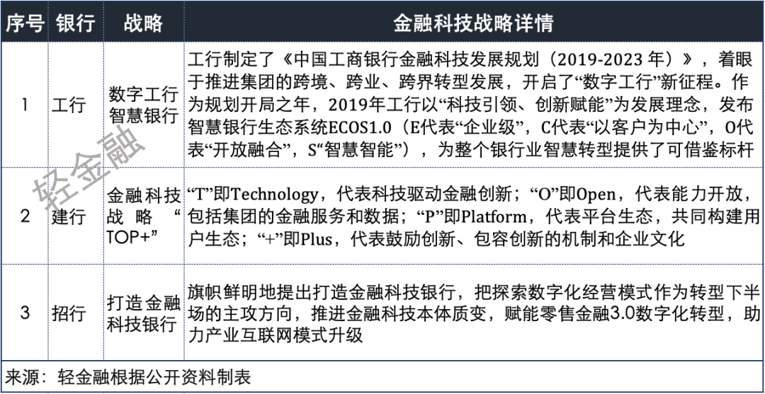 战略决定成败。工行、建行、招行都注重强化金融科技顶层设计,站在全局高度去推进数字化转型,并以自身特色出发构建了差异化的金融科技战略。