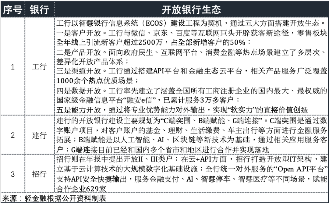 只有生态足够开放,金融服务才能将自身的服务与产品向更多领域、更大的用户群延伸,三家银行都在打造多层次的开放银行生态。
