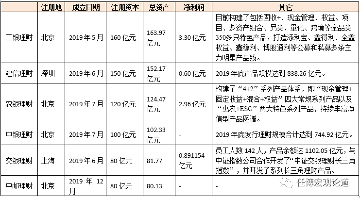 目前国有六大行均已在2019年成立了理财子公司并实现开业,注册资本从高到低依次为工银理财(160亿元)、建信理财(150亿元)、农银理财(120亿元)、中银理财(100亿元)、交银理财(80亿元)、中邮理财(80亿元)。