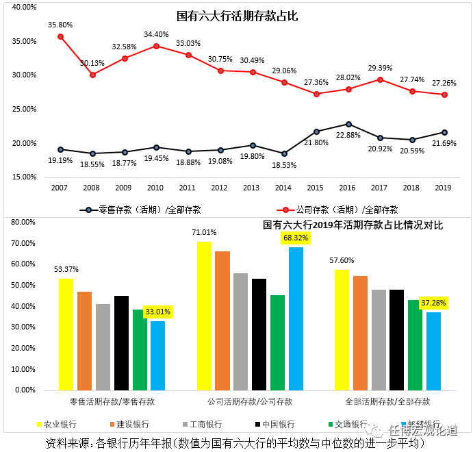 国有六大行的优势不仅在于存款占比高、零售条线贡献大,还在于其存款中的活期比例也较高,可以说国有六大行的全部存款中,50%左右为低成本的活期。当然拉长期限来看国有六大行的公司活期存款占比略有下降,但零售活期存款的地位却在明显提升。例如,2007-2008年国有六大行的零售活期存款占全部存款的比例约为18.50-19%,2019年这一数值已升至21%以上。