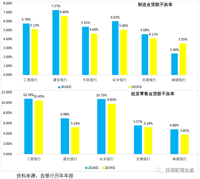 国有六大行在制造业、批发零售业两个领域的贷款质量均较差(基建领域、房地产领域与零售贷款领域的资产质量较好),前者主要指实体经济,后者和租赁商务业一起统称为商业(主要为中小微企业),而这两个行业也一直是政策所鼓励的信贷投向。可见如果连国有大行在这两个的贷款质量都很差,那对于其它银行来说则可想而知。例如,工商银行的批发零售贷款不良率高达10%以上,农业银行的也在10%左右。此外建设银行的制造业贷款不良率高达6.60%,工行与农行的制造业贷款不良率也均在5%以上。