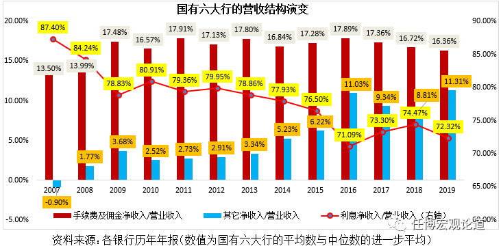 虽然过程有所反复,便利差收入在营业收入中的占比下降的趋势却比较为明显,2007年这一比例高达87.40%,2019年则大幅降至72.32%。与此同时,手续费及佣金净收入的占比则反复特征明显,2007年手续费及佣金净收入占营业收入的比例为13.50%,2019年则为16.36%,但却是2009年以来的最低数值。