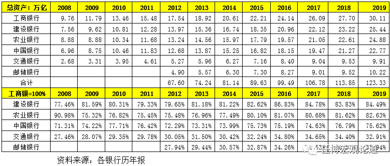 其中,工行总资产规模突破30万亿至30.11万亿,邮储银行总资产突破10万亿至10.22万亿(超过交通银行位列国有大行第5),交通银行总资产逼近10万亿,建行、农行和中行总资产规模均在20万亿以上。其中,国有六大行的总资产规模已经达到2019年经济总量的1.23倍。