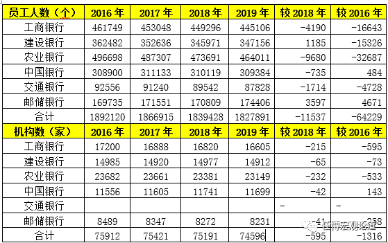 对于机构数而言,也同样呈现类似特征,如2019年工行和农行机构数分别减少215家和232家,建行、中行和邮储银行分别减少65家、42家和41家。特别是自2017年以来工行和农行机构数分别净减少595家和533家,邮储银行机构数则净减少258家。
