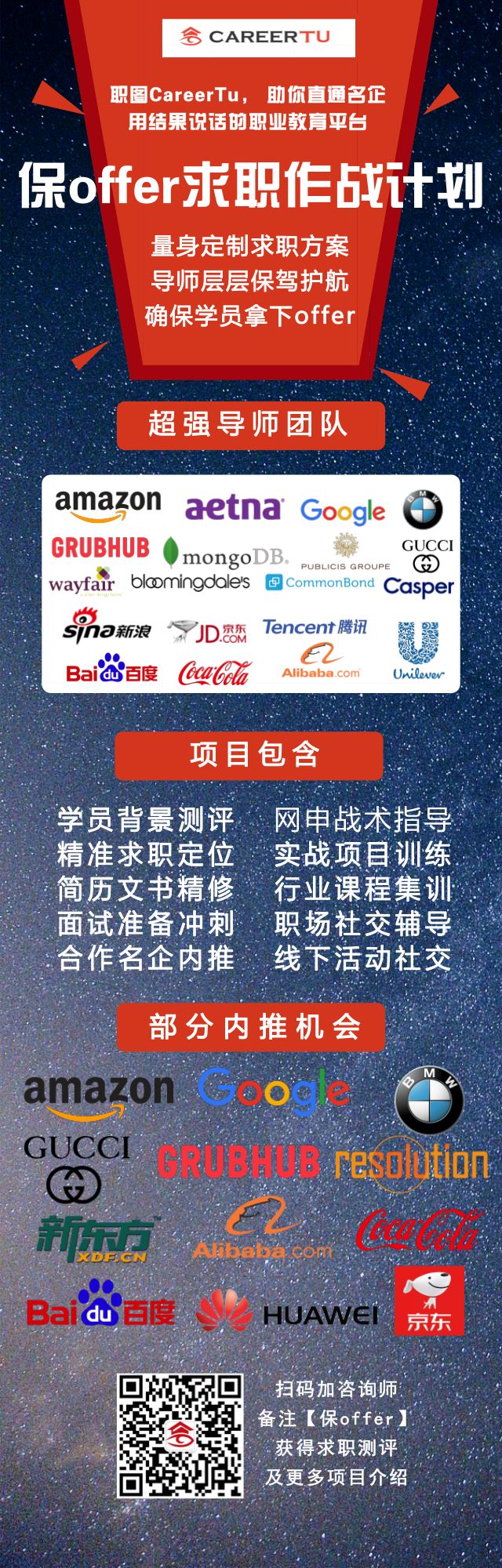 因此我决定通过实际的行动去实践:我联系了很多中美的优秀互联网大数据行业的营销人,还有中美的知名企业的HR,和他们建立了深度合作关系,推出了职图【保Offer求职作战计划】,希望帮助有着远大职业理想和目标的小伙伴们,和他们的伯乐更好地匹配起来。