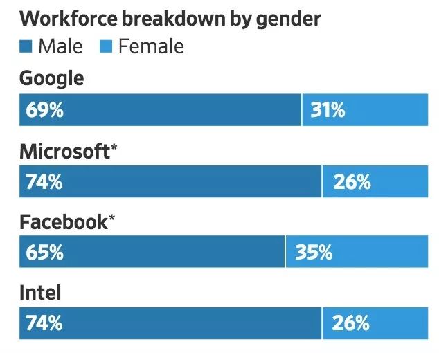 谷歌在2014年第一次发布了透明度报告,报告中显示70%的员工是男性,其中91%是亚裔和白种人的男性。到了2017年,男性比例下降到了69%,也就是说三年过去了,这个比例仅仅下降了1%。
