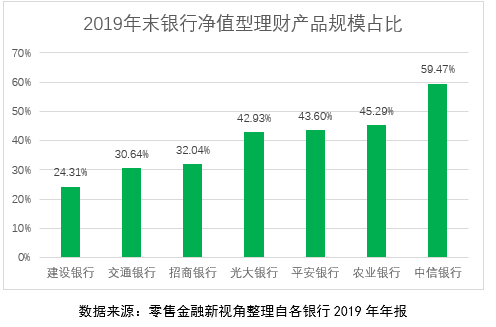 不过银行理财净值化转型速度仍然较慢,截至2019年末,除了中信银行净值型理财产品规模占非保本理财产品余额的比例为59.47%,其他银行净值型理财产品规模占比均在50%以下。农业银行、平安银行、光大银行、招商银行、交通银行、建设银行的净值型理财产品规模占比分别是45.29%、43.6%、42.93%、32.04%、30.64%、24.31%。建设银行净值型理财规模在这些银行中处于垫底水平。