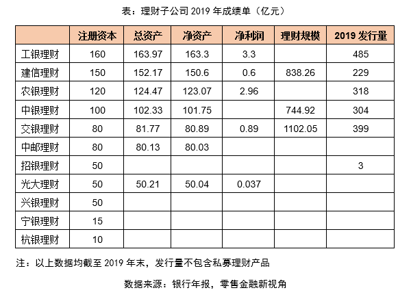 近期,多家银行公布了2019年报,其中7家银行公布了理财子公司的资产状况,5家披露了理财子公司的盈利状况。工银理财的注册资本、总资产、净资产、净利润均位居首位。