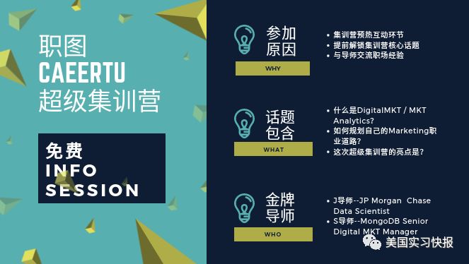 不过这里提一句,如果您对数据营销科学感兴趣,职图CareerTu超级集训营的导师不仅在互联网营销和数据分析行业有着多年的从业、招聘经历,还有丰富的授课经验。我们曾带领一共超过5000+名学员学习互联网营销知识和趋势,而2月21日将举行的本次集训营的预热互动活动--免费Info Session!