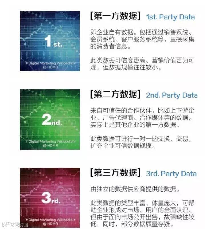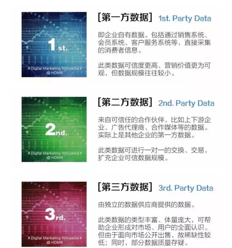 先说第一种,也是更广为人知和应用的一种。伴随互联网和信息技术发展,几乎一切行为都可以数据化,品牌企业掌握消费者的购买数据、媒体广告投放获取的行为数据以及社交、电商等其他网站拥有的更大了的数据,共同构建了一个数据库。也就是大家口中常说的第一方、第二方、第三方数据: