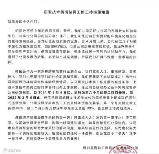 通告的大意是帕拓逊虽然历经了几个月的自救,但是目前资金周转依然比较困难,因此研发技术岗将从2021年8月6日到2022年2月6日停工待岗安排。
