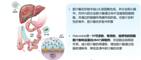 在某些疾病状态下,胆汁酸的代谢和排泄会出现问题,导致胆汁酸在体内积累,引起肝脏损伤和一系列临床症状。奥维昔巴特(Odevixibat)的作用就是通过减少胆汁酸的再吸收,降低其在体内的浓度,从而减轻肝脏的负担和相关症状。