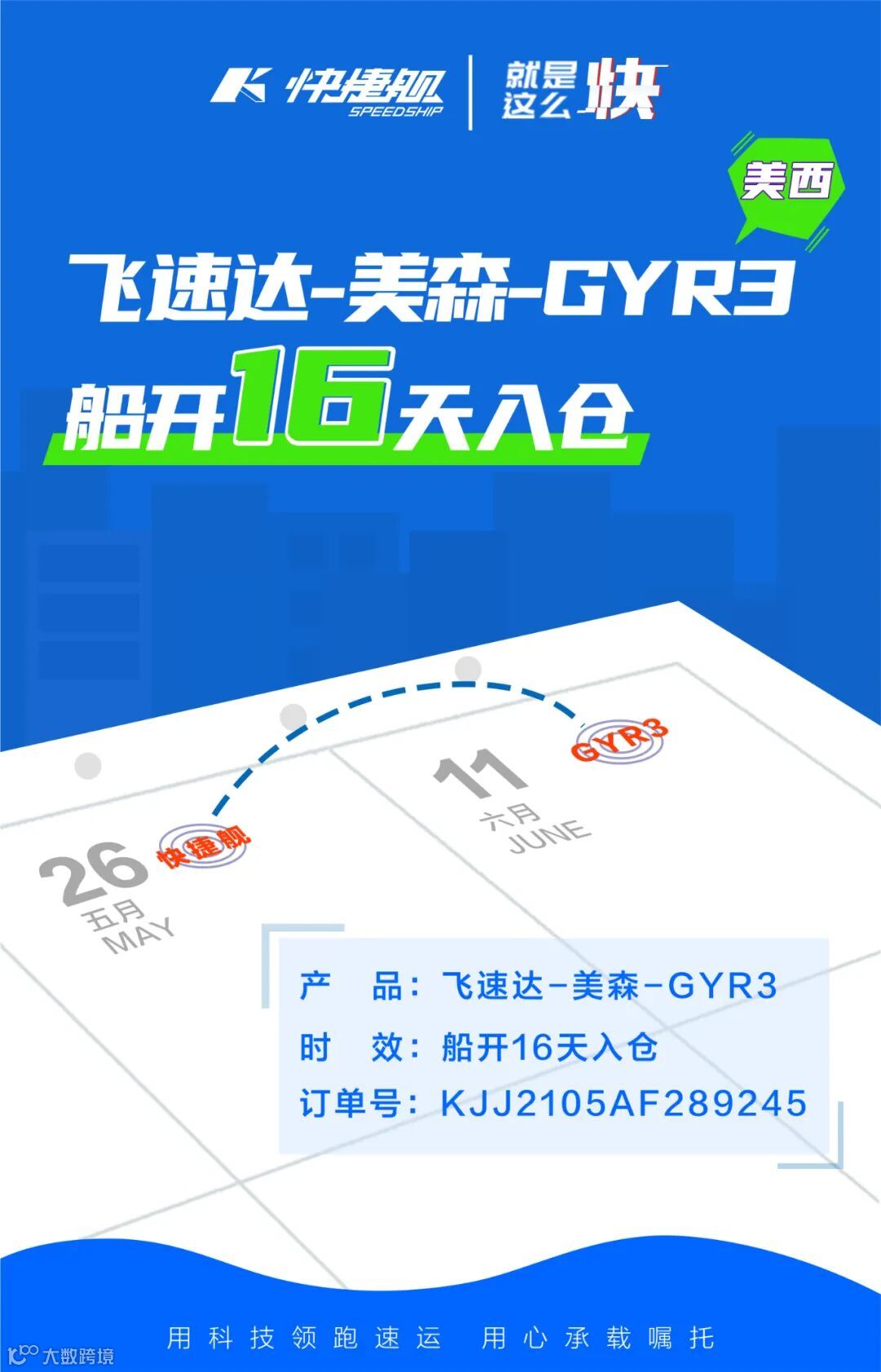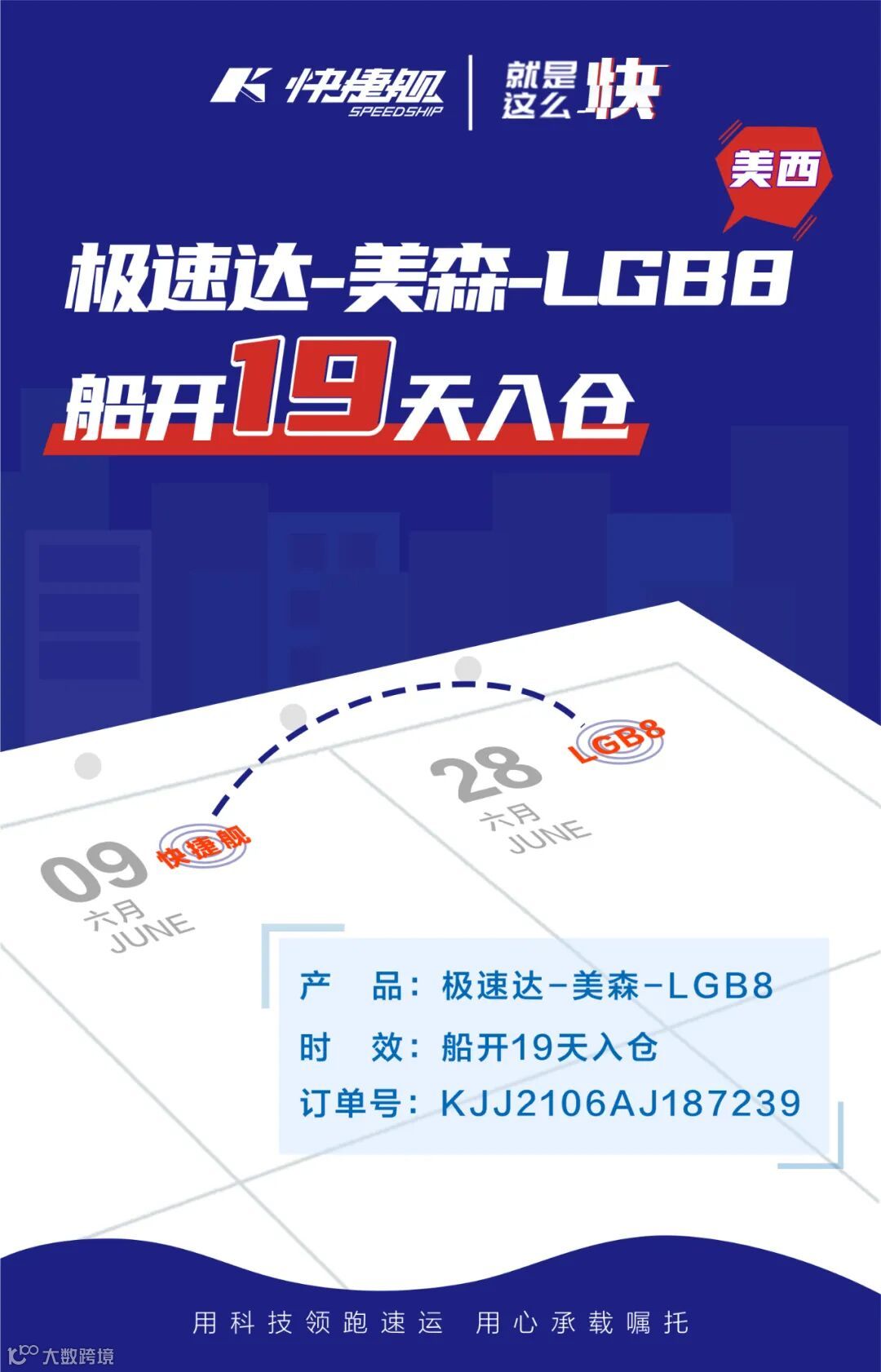 美西线:快捷舰飞速达产品,船开16天即入仓,选的船同样也是美森船,时效快,价格比极速达便宜!经济实惠又能满足时效的需求,选ta!