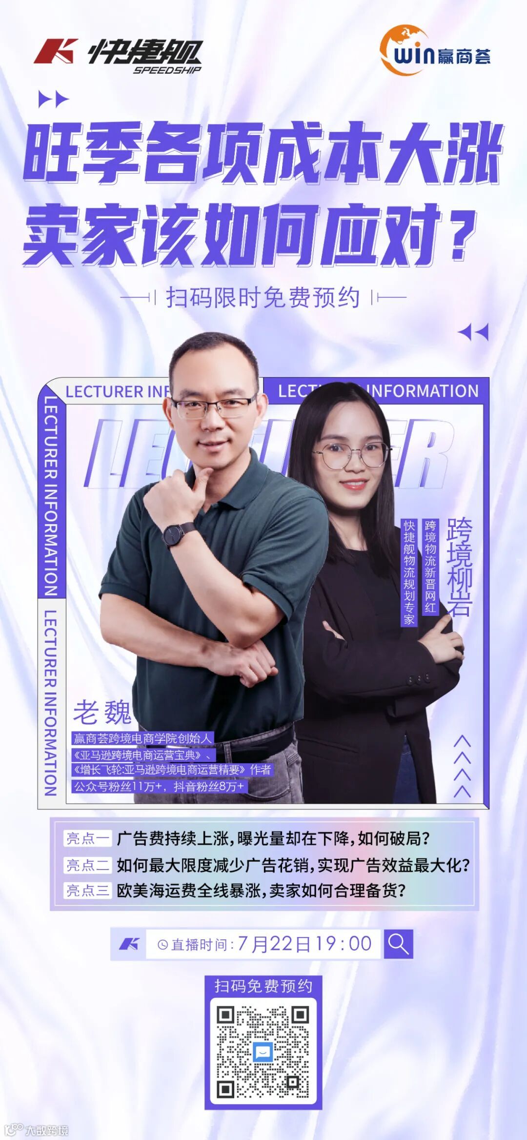 快捷舰邀请赢商荟老魏以及跨境柳岩为大家揭开谜底!7月22日晚19:00快捷舰直播间约定你!赶紧扫码下方二维码预约直播吧!