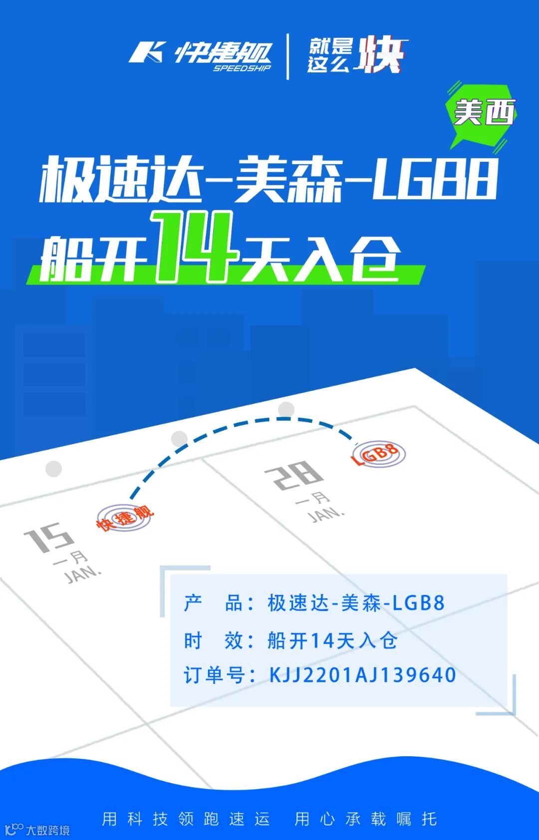 美西线:美西仓库LGB8,依旧是船开14天即入仓,这速度优秀!极速达甄选美森船,速度杠杠的!极速达可是我们快捷舰的时效王者!