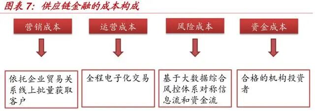 供应链金融的利差空间有限。(1)贷款利率在年化 10-18%之间。供应链金融的终端客户可接受的利率水平较低。企业融资目的主要用于生产经营,中小企业竞争压力大,利润空间小,能承担的资金成本有限。(2)资金成本一般在 5-8%之间,银行资金最低的成本为5%。