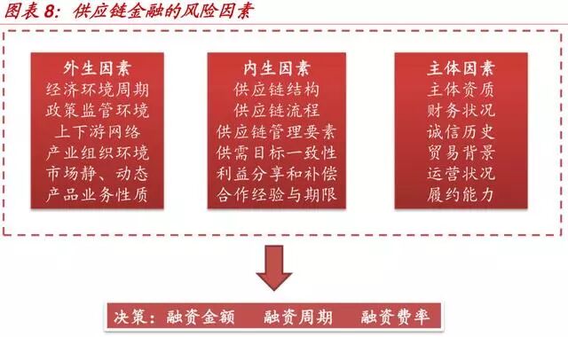 供应链金融的风险因素包括外生因素、内生因素和主体因素。根据这些因素的综合评定进行决策,确定贷款的额度、周期和费率。