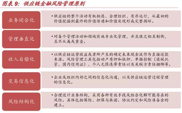 供应链金融的风控模式创新。主要的风控手段包括核心企业的信用背书、 担保以及存货质押等。通过四流合一确保交易的真实性,把单个企业的不可控风险转变为供应链企业整体的可控风险。