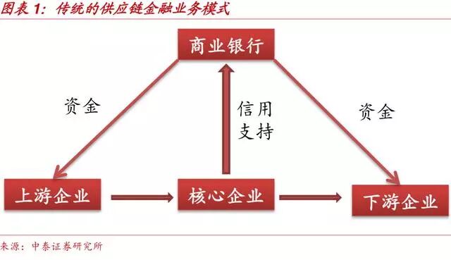 传统供应链金融的本质是利用核心企业的信用支持为上下游的中小企业提供信贷服务。供应链是产品从原材料到商品的整个流转链条,连接供应商、生产商、批发商、零售商和最终消费者的所有交易过程。供应链金融是围绕供应链上的核心企业,为上下游企业提供融资服务,其核心是掌握商流、信息流、物流、资金流,依托核心企业的信用支持的融资模式。