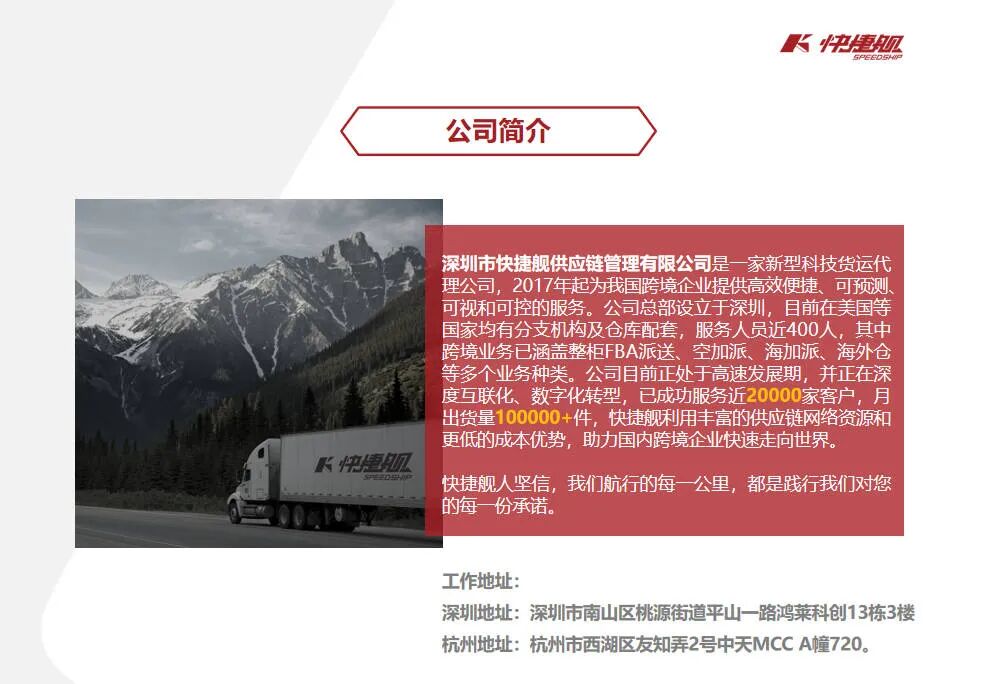 深圳市快捷舰供应链管理有限公司是—家新型科技货运代理公司,专注美国FBA头程,2017年起为我国跨境企业提供高效便捷、可预测、可视和可控的服务。其中跨境业务已涵盖整柜FBA派送、空加派、海加派、海外仓等多个业务种类。