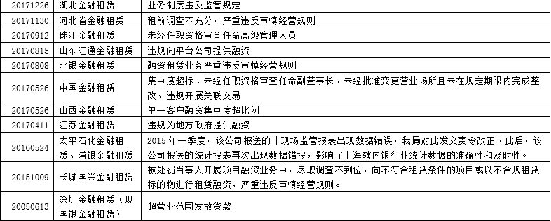 我们汇总了所有与金融租赁公司相关的处罚案例(合计共30个),归纳发现监管处罚案主要集中在以下几个方面。