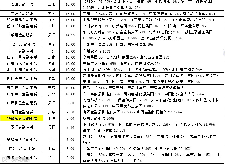 2、注册地在上海的金融租赁公司有10家,分别为交银金融租赁、农银金融租赁、交银航空航运金融租赁、浦银金融租赁、太平石化金融租赁、招银航空航运金融租赁、招银金融租赁、长江联合金融租赁、华融航运金融租赁、广融达金融租赁。