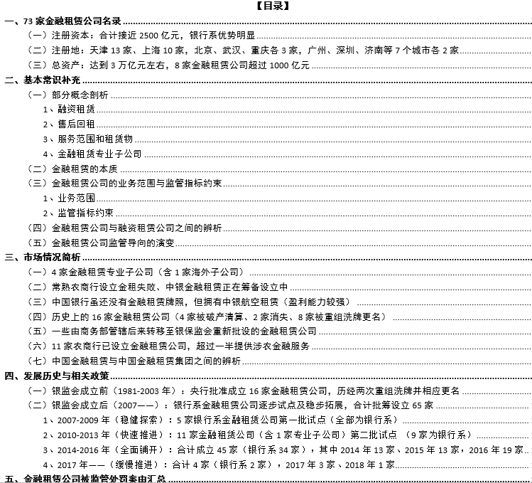 本文所讨论的73家金融租赁公司包括4家金融租赁专业子公司(包括交银金融租赁的交银航空航运金融租赁、华融金融租赁的华融航运金融租赁、招银金融租赁的招银航空航运金融租赁、国银金融租赁的国银航空租赁等),且控股均为100%。其中国银航空租赁于2016年9月获批在爱尔兰成立的一家海外金融租赁专业子公司(注册资本为5000万美元)。