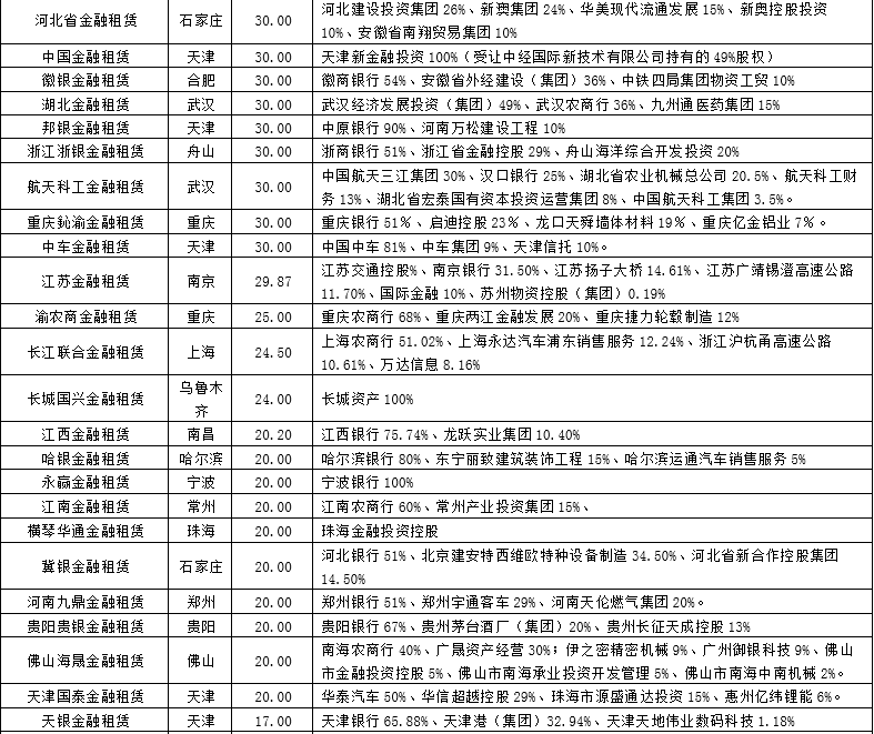 另外12家金融租赁公司分别为中国租赁、中国电子租赁、中国外贸租赁、上海新世纪租赁、浙江租赁、江苏租赁、河北租赁、山西租赁、四川租赁、甘肃租赁、新疆租赁以及深圳金融租赁,不过这12家金融租赁公司的命运也各有不同(参见下文)。