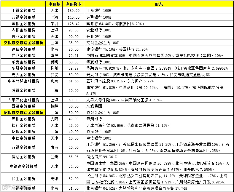 其中,超过100亿元的金融租赁公司有3家,分别为工银金融租赁(180亿元)、交银金融租赁(140亿元)、国银金融租赁(126.42亿元);注册资本在50-100亿元之间的金融租赁公司有13家。